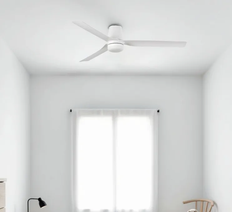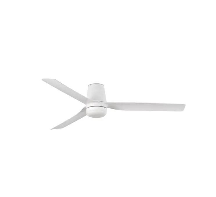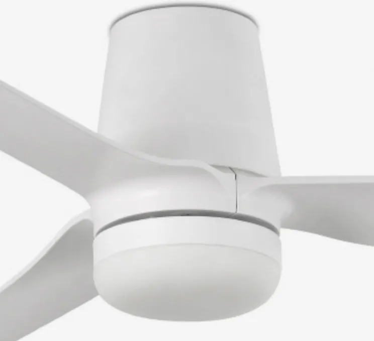 Le ventilateur est doté de 3 pales en ABS finition blanches, non réversibles, et ne convient pas pour une installation sur un plafond incliné. Il est conçu avec un corps en acier blanc mat et un diffuseur en verre opale, ajoutant une touche élégante à tout intérieur.