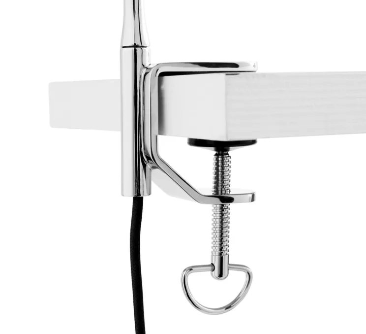 Avec son design cubique et son charme rétro, elle incarne une esthétique intemporelle qui peut se fondre harmonieusement dans divers styles de décoration intérieure tout en apportant une touche de caractère. Elle se compose d’une plaque de métal colorée et courbée pour abriter la source lumineuse. Elle possède une tige rattachée à une pince qui lui permet d’être accrochée là où vous en avez besoin.