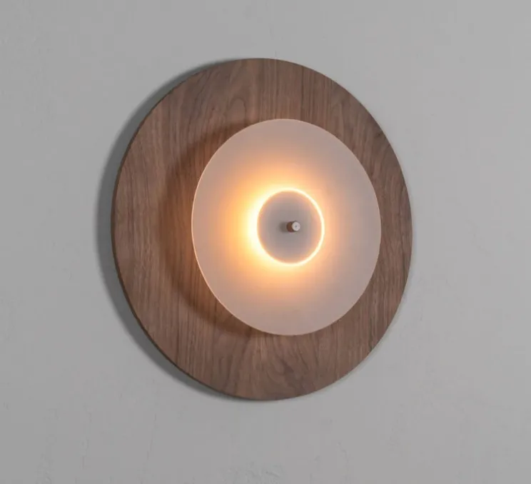 Sa conception minimaliste se dessine à travers trois cercles distincts, divisés par une ligne verticale, où le cercle supérieur en bois se soutient élégamment par deux éléments en verre sablé. La fins tige d’aluminium souligne avec précision la géométrie raffinée de cette applique, ajoutant une touche artistique à tout espace.