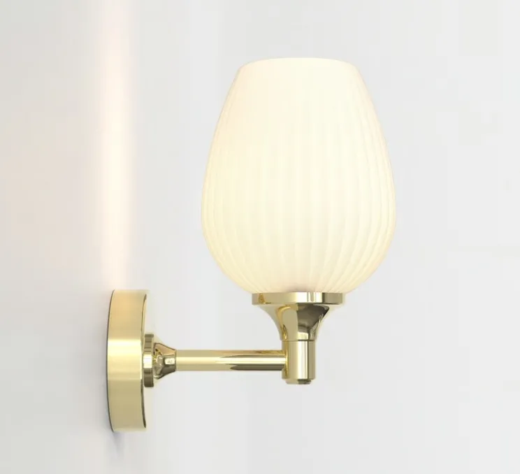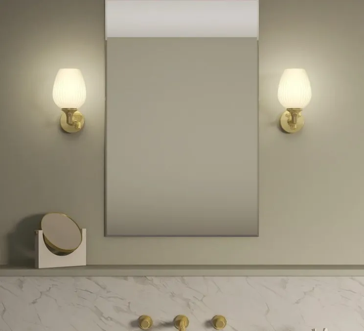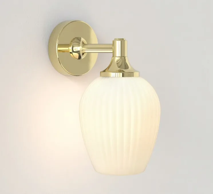 Ce modèle mural en métal laiton poli, doté d’un abat-jour en verre opalin, combine design décoratif et exigence technique pour répondre aux environnements humides.
