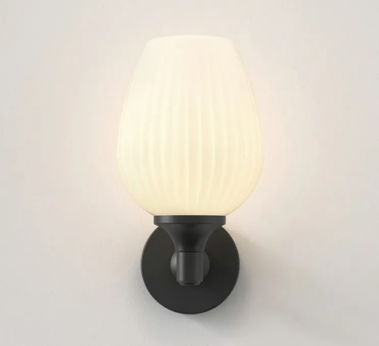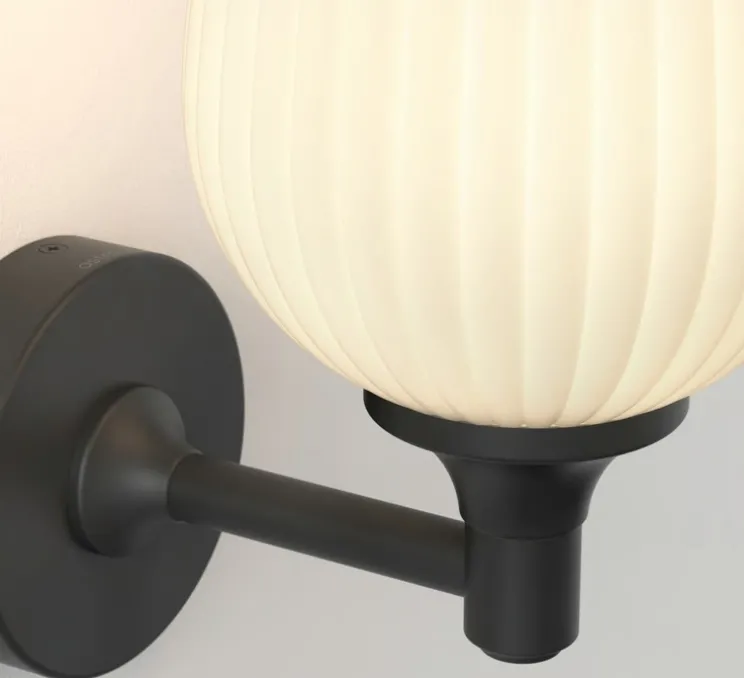 Ce modèle mural en métal noir mat, doté d’un abat-jour en verre opalin, combine design décoratif et exigence technique pour répondre aux environnements humides.