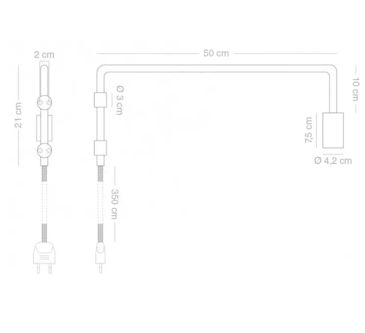 La potence pivotante Adam mesure 4,2cm de longueur, 21cm de hauteur et 50cm de profondeur. Cette lampe potence à interrupteur est équipée d’un câble textile de 350 cm, d’une prise et d’un interrupteur blancs. La distance entre l’interrupteur et le début de la lampe est de 65 cm. Entraxe : 2cm. Vis de fixation incluses. L’ampoule Led E27 d’une puissance maximale de 6W n’est pas fournie mais est recommandée pour le bon fonctionnement du luminaire.