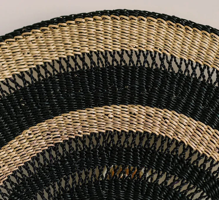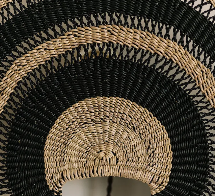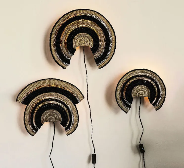 Le luminaire Admirador se compose d’une base murale avec câble et interrupteur et d’un abat-jour tissé plat, dont la forme reprend la forme du classique éventail Bolga. L’abat-jour est tissé à la main par des artisans selon l’art du tissage Bolga, artisanat typique de la région de Bolgatanga dans le nord du Ghana. Le matériau utilisé pour le tissage est une herbe, l’herbe Veta Vera : elle est cultivée localement et récoltée pour ensuite être torsadée et tordue, jusqu’à créer des fibres résistantes et lisses, qui seront finalement teintes avec des pigments naturels. Le rythme du tissage laisse passer les rayons de la lumière, pour apporter une touche de douceur et de naturel à chaque intérieur. Naturelle et belle, l’applique Admirador s’installe aussi bien dans une chambre, que dans un couloir ou d’une pièce de vie.