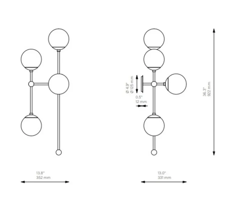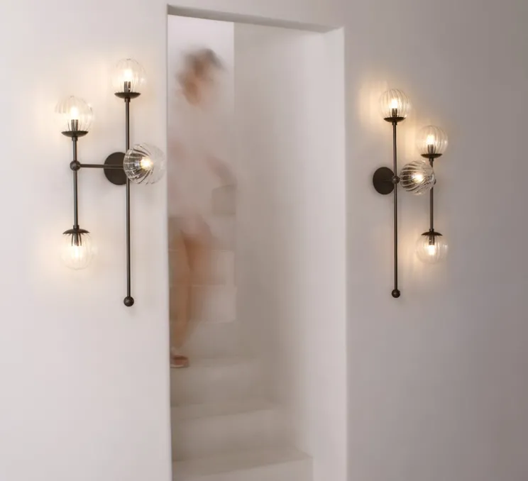 L’applique se présente sous la forme de barres métalliques entrecroisées et surmontées de 4 globes en verre texturé. Les barres de la structure sont reliées entre elles par des nœuds. Ce design à l’apparence brute est adouci par la présence des sphères, qui apportent de la délicatesse à l’ensemble.