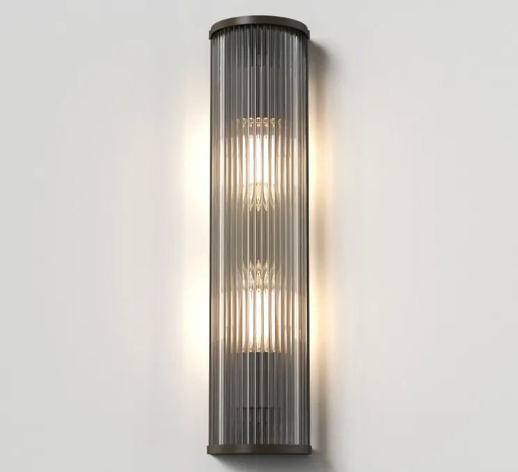 Son profil arrondi défini par des tiges en verre transparent et sa finition en laiton antique apportent une touche de luxe et permettent une diffusion plus douce que son homologue en bronze. L’éclairage est vif mais confortable et sans éblouissement. Elle trouve sa place dans tous les types d’espaces même ceux combinant des couleurs sombres dans lesquels elle apportera une lueur riche et chaleureuse. Elle est notamment pensée pour les milieux hôteliers. L’applique se fixe au mur grâce à une vis discrète n’enlevant rien à son esthétique uniforme.