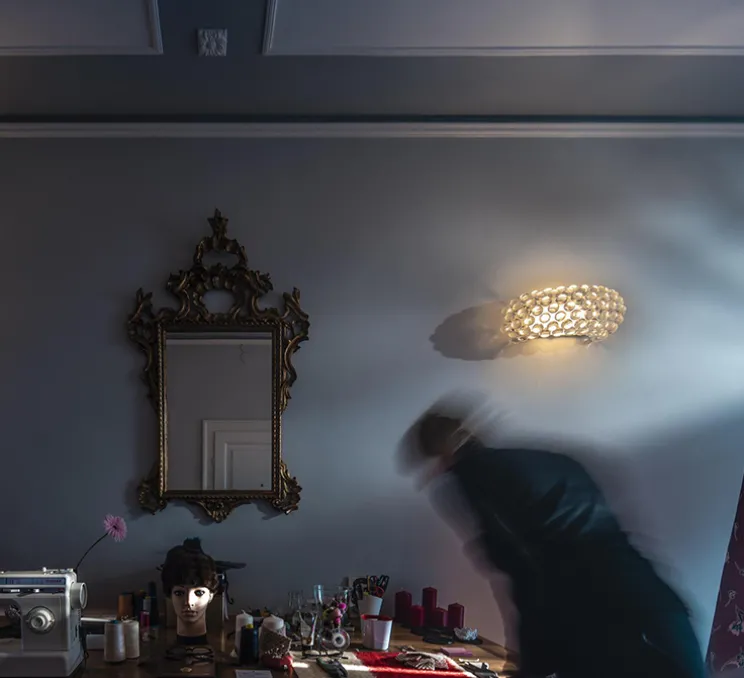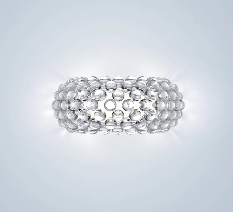 Des perles de lumière flottant dans l’espace : l’applique Caboche Plus est composée d’une structure sur laquelle se monte une multitude de sphères et d’un support de montage. La structure est faite d’arceaux en zig-zag, tout simplement invisibles, ne masquant ni la lumière, ni le regard ; exaltant la transparence tout en améliorant la résistance. Un système simple d’ancrage twist-lock permet un montage facile et stable des sphères sur la structure. Une fois les sphères montées, la structure disparaît complètement de la vue ; les sphères semblent flotter dans le vide, dans un superbe effet de transparence totale. Aussi précieux, sophistiqué et léger qu’un bracelet de perles, Caboche est un bijou de transparence et de luminosité, au caractère unique. Allumée, la lumière du luminaire se diffuse à travers une mosaïque de réfractions, éclairant l’espace dans toutes les directions. Caboche décore et illumine les intérieurs les plus classiques comme les plus contemporains, s’intégrant facilement dans un salon, comme dans une chambre ou une entrée.