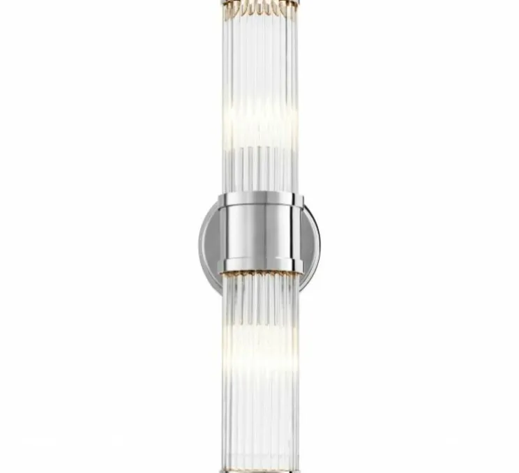 Cette applique est disponible en version simple ou double, en finition laiton antique ou nickel et dispose d’un un abat-jour en verre transparent nervuré et biseauté pour plus de profondeur et de glamour.