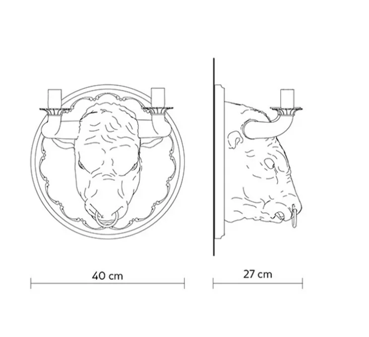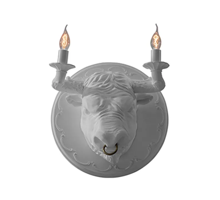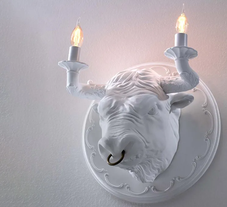 Le luminaire Corrado est composé, tel un trophée de chasse, d’une base murale, sur laquelle est montée une tête de taureau en céramique, finition blanche matte, dont les cornes se terminent par un chandelier, chacun pouvant accueillir une ampoule. Impertinente et unique, l’applique murale s’installe aussi bien sur le mur d’une entrée, que d’une pièce de vie ou d’un couloir.