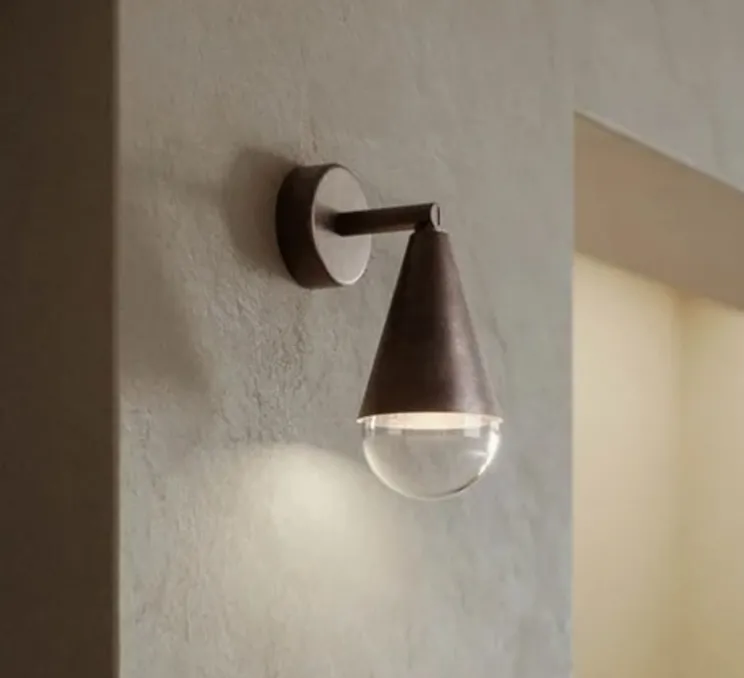 L’applique se compose d’un cône en fer qui surmonte une demi-sphère en verre. À travers ce luminaire, Il Fanale démontre son savoir-faire dans la métallurgie.