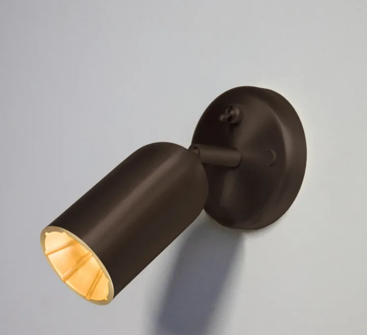 Son corps cylindrique compact, d’un diamètre de 7 cm, s’habille ici d’une finition en bronze foncé, à la fois chaleureuse et subtile. Montée directement au mur, elle assure une présence discrète tout en créant des points de lumière ciblés. Ce type de luminaire trouve naturellement sa place dans un couloir, une alcôve ou sur un mur d’exposition, en accompagnement d’une ambiance sobre ou plus graphique.