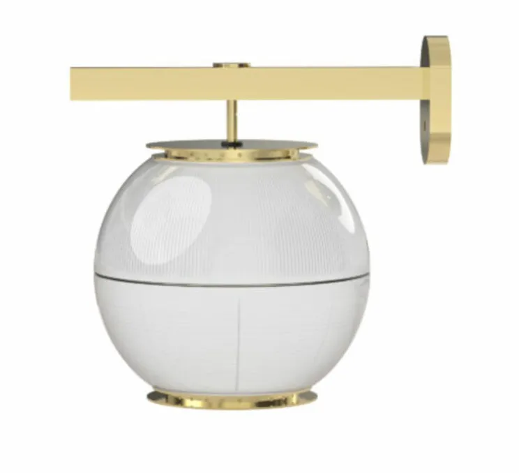 De forme spherique, cette applique est composée de deux abat-jour semi-sphérique en verre imprimé avec une finition intérieure satinée et une teine extérieure brillante. La sphère est suspendue à une structure en laiton poli qui supporte 3 ampoules.