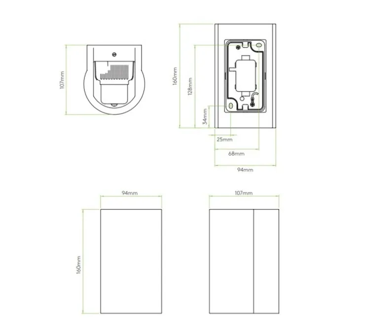 Dunbar 160 led mesure 16 cm de hauteur, 9,4 cm de longueur et 10,7 cm de profondeur. Le module Led intégré a une puissance de 6,3W et diffuse 97 lumens avec une colorimétrie de 3000K. Ce luminaire n’est pas variable mais est compatible avec l’option « Smart Lighting » grâce aux accessoires Casambi. Driver non requis. Possède un IRC de 90. Montage mural vertical.