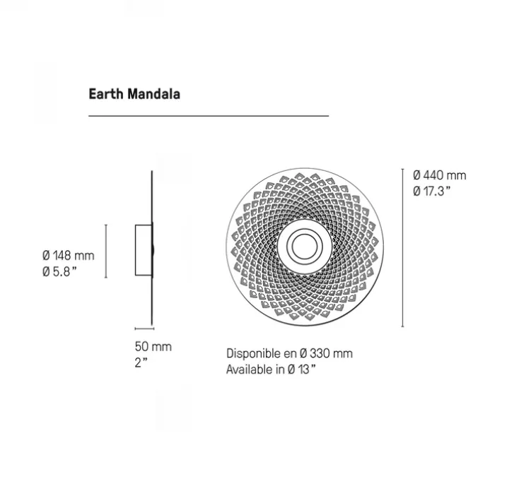 L’applique Earth Mandala XS mesure 33cm de diamètre. Elle est fournie avec sa source de lumière LED, 2700 kelvins et 990 lumens (blanc chaud). Ce modèle est disponible en d’autres formats et en de multiples déclinaisons.