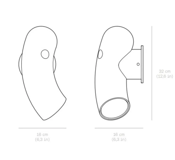 Ce luminaire est composé d’un corps cylindriques tout en rondeur rattachée à une fixation murale en son milieu. Cette disposition permet d’adapter l’orientation et la position du corps. La source lumineuse vient refermer le cylindre.