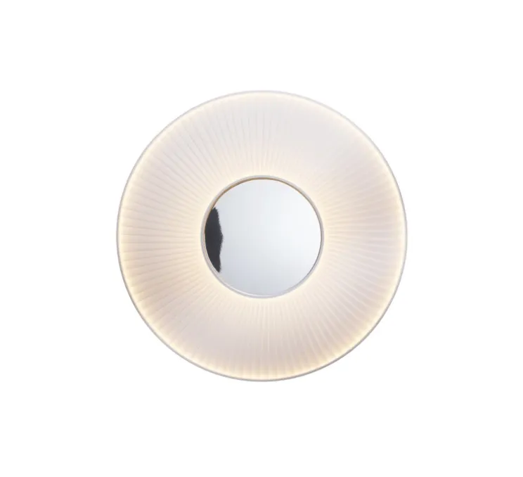 Iris est un soleil d’intérieur. Sa lumière est puissante, douce et diffuse à la manière d’un astre. Elle se compose d’un abat-jour en ruban blanc et d’une structure qui repose contre le mur pour devenir presque invisible et laisser resplendir le luminaire. En son centre se situe un miroir qui reflète l’environnement alentour pour donner de la profondeur à votre pièce.