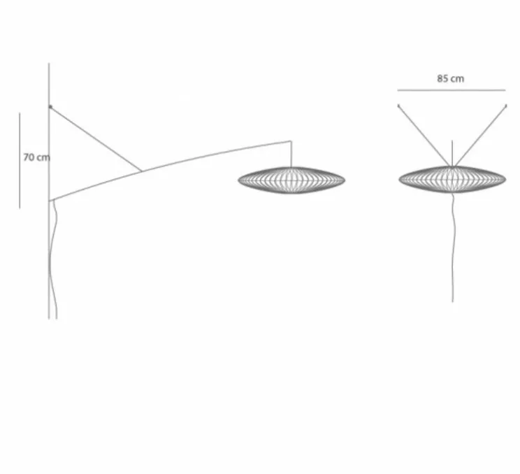 La structure est composée d’un tube d’acier, de cordelette, et d’un astucieux système qui permet de maintenir la perche en appui sur le mur. La tige permet de suspendre délicatement à une grande distance du mur l’abat-jour. Le système est orientable grâce au nœud coulissant qui maintient la tige.