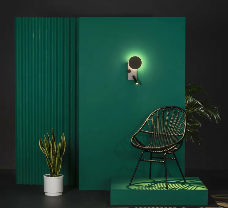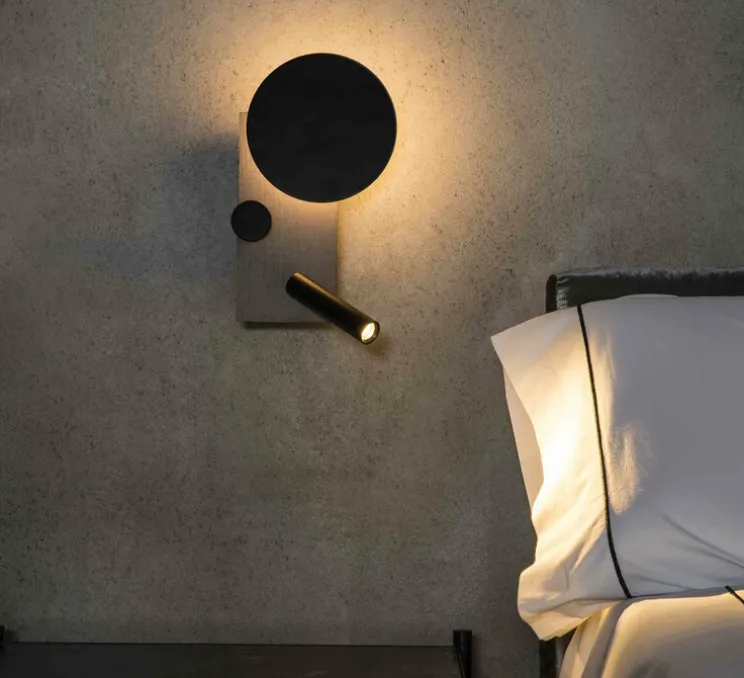 C’est une applique en gris texturé conçue par Isaac Piñeiro. Elle possède une liseuse réglable sur le côté droit, et une lumière indirecte qui est projetée à travers le faisceau lumineux circulaire. La lumière indirecte est réglable et actionnée à l’aide d’un interrupteur visible sur la structure. Elle peut être installée verticalement ou horizontalement.
