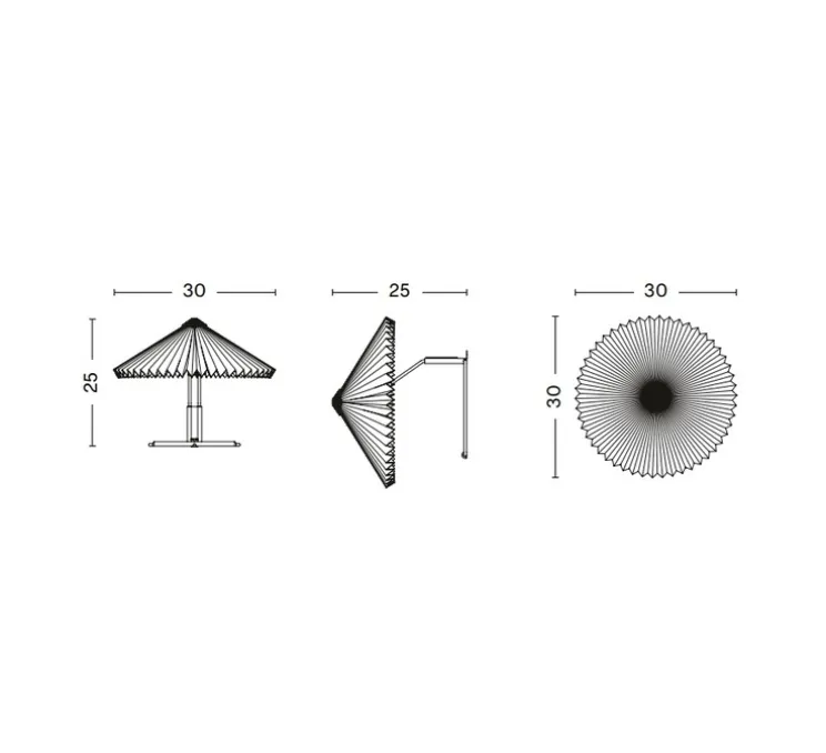 Matin propose un design à la fois contemporain et poétique, avec une construction qui allie finesse visuelle et robustesse physique. La lampe comprend un support en acier pour le montage au mur, et est recouverte d’un abat-jour en coton plissé rouge.