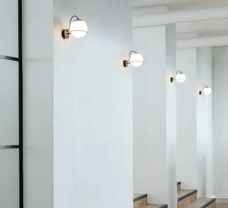En effet, le fondateur d’Astep, Alessandro Sarfatti, a voulu rendre hommage à son grand-père en rééditant ces œuvres. Avec son verre oplalin sphérique avec une structure couleur champagne, cette applique fait partie de la collection iconique de Gino Sarfatti. Ce luminaire a été conçu initialement en 1959 et a été réédité en 2018 !