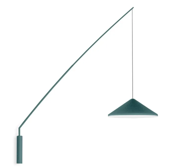 L’applique North de Vibia, conçue par Arik Levy, se caractérise par sa base murale discrète d’où partent deux tiges fendues en fibre de carbone, chacune surmontée d’un abat-jour conique en aluminium laqué mat.