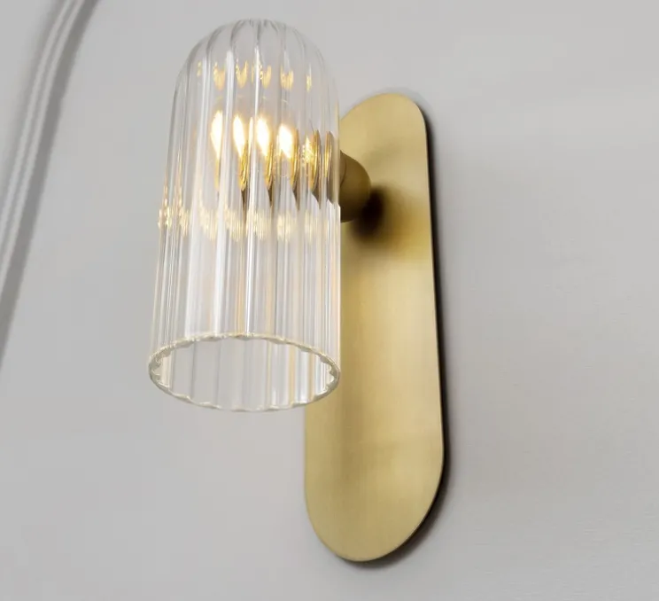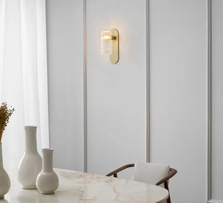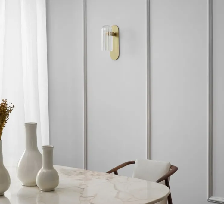 Odyssey est une applique murale composée d’une base en laiton ovoïde et d’un abat-jour en forme de cloche. Odyssey diffuse une lumière sereine vers le bas, et apporte une touche de simplicité intemporelle et élégante, qu’elle soit installée sur le mur d’un salon, d’un couloir ou d’une chambre.