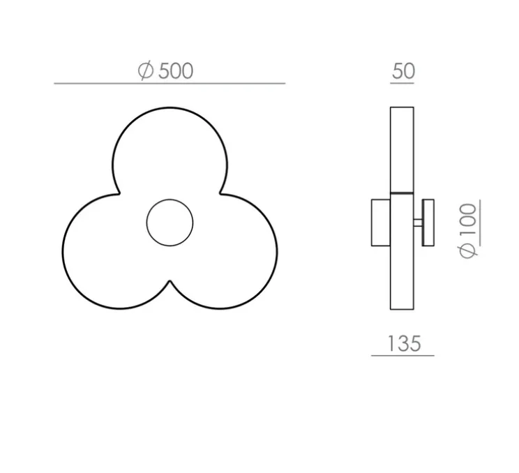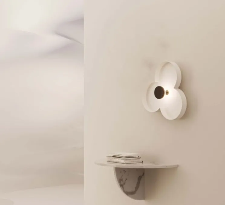 Sa forme organique évoque une fleur stylisée, avec un diffuseur blanc mat agrémenté d’un disque noir central. Elle incarne une élégance subtile, où la simplicité géométrique dialogue avec une lumière indirecte parfaitement maîtrisée.