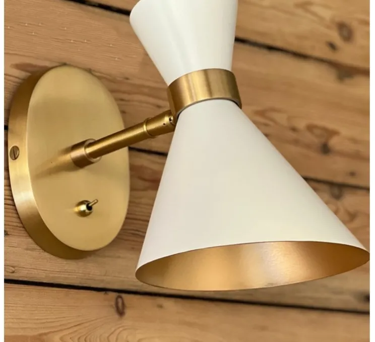 La petite applique Peggy blanche a une base en laiton avec une finition antique et un abat-jour mat qui s’harmonise avec la teinte dorée à l’intérieur. La cale réglable permet également de faire pivoter la lampe vers le haut et vers le bas en fonction de vos besoins, mais elle n’est pas destinée à être déplacée par la suite.