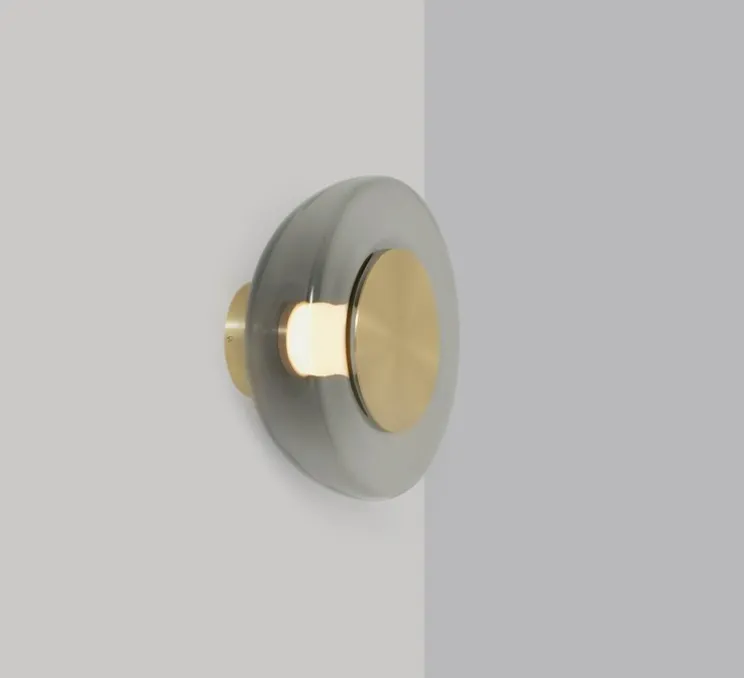 Cette applique murale est constituée d’une base en laiton satiné surmontée d’un abat-jour en verre soufflé fumé avec un disque en laiton en son centre. Le design unique de cette lampe lui donne un caractère hypnotisant, comme son nom l’indique il rappelle la forme des horloges comtoises.