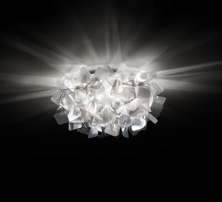 Clizia M reprend les formes de la nature : c’est un nuage qui capture la lumière du soleil aux premières heures du jour et qui se charge de reflets chatoyants, c’est la cime d’un arbre à travers laquelle filtre la lune en créant des jeux d’ombres. Clizia donne à votre environnement la lueur romantique des premières heures de l’aube. Avec sa forme peu commune Clizia s’intègre dans une chambre, un salon ou un bureau.