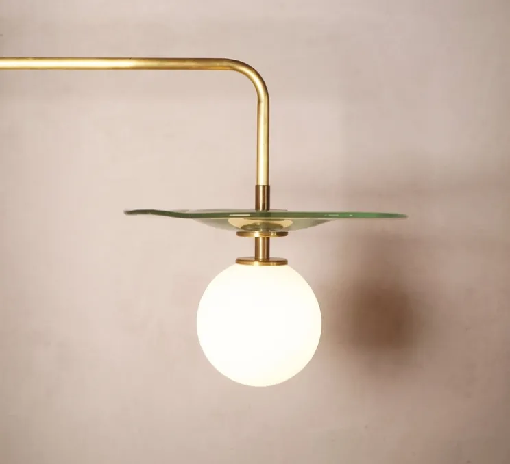 Cette applique à l’aspect minérale qui semble s’inspirer de l’environnement méditerranéen est conçue à partir d’une structure en laiton et d’un disque en verre soufflé dans la verrerie de Gordiola ́s à Majorque.