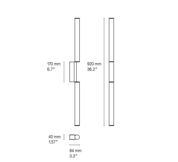 L’applique mesure 92cm de hauteur, 4cm de longueur et 8,4cm de profondeur. Elle est fournie avec sa source de lumière LED diffusant 2700 kelvins et 1340 lumens (blanc chaud). Variable coupure de phase.
