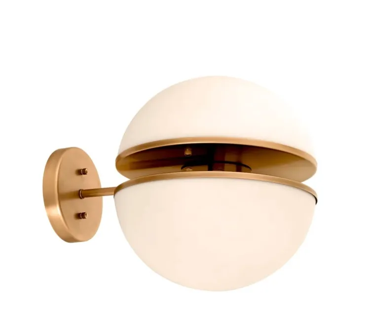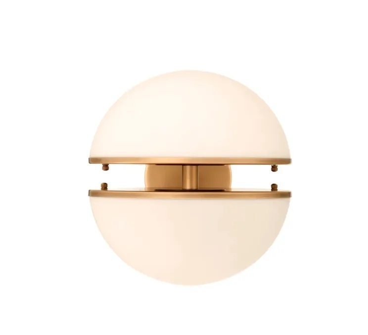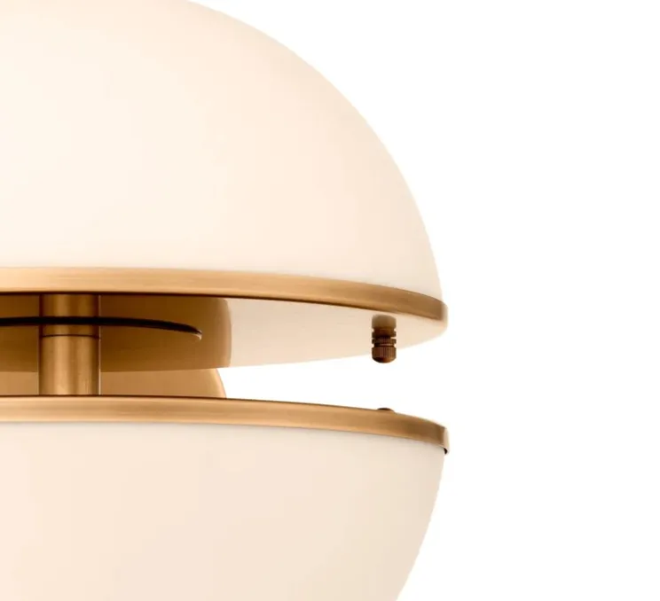 Elle se distingue par une structure en laiton antique, joliment poli, et un abat‑jour en deux hémisphères de verre opalin blanc séparées par un fin espace circulaire qui révèle subtilement la source lumineuse.