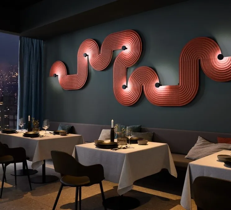 Ce luminaire mural de surface combine éclairage et absorption sonore grâce à son intégration dans un élément acoustique en feutre de PET de haute qualité. Sa finition en feutre oxyde rouge apporte une touche esthétique, tandis que la lumière indirecte crée une ambiance chaleureuse. Il s’installe parfaitement dans des espaces comme la cuisine, le salon, ou les bureaux, où il améliore à la fois le confort visuel et acoustique.