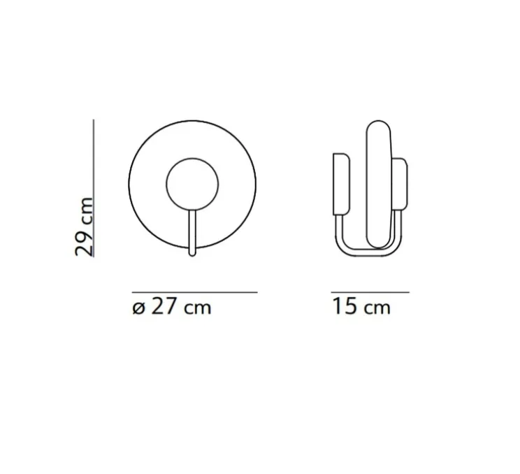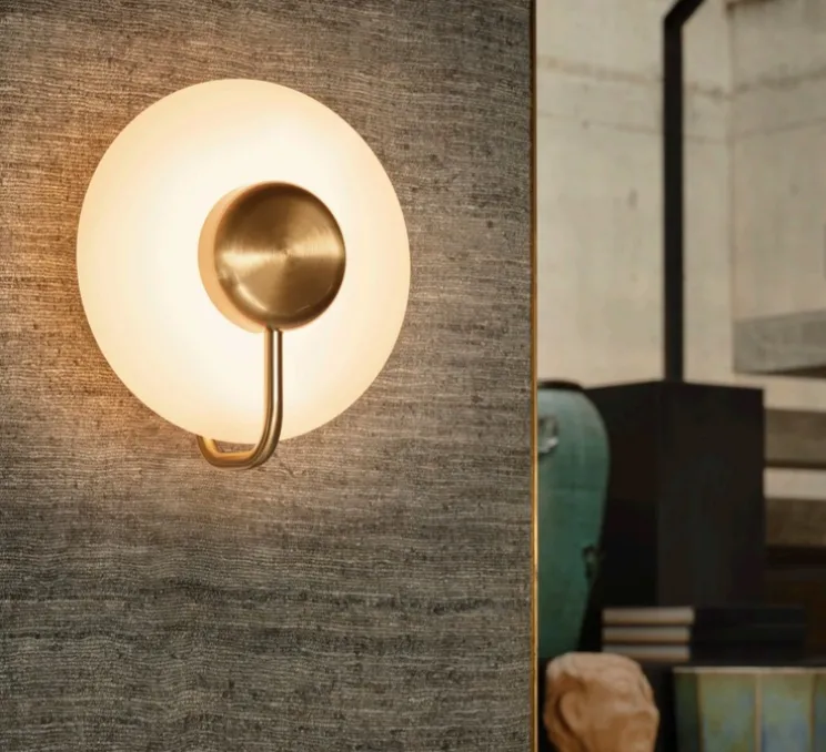 Sa structure en métal peint laiton dessine une ligne discrète mais expressive qui s’intègre avec justesse sur tous types de murs. Le diffuseur en verre opalin offre une lumière douce, tandis que la forme circulaire de l’applique crée un relief subtil de lumière et d’ombre. Tratto se pose seule comme point d’accent ou se multiplie pour composer un rythme visuel décoratif dans un couloir ou un salon.