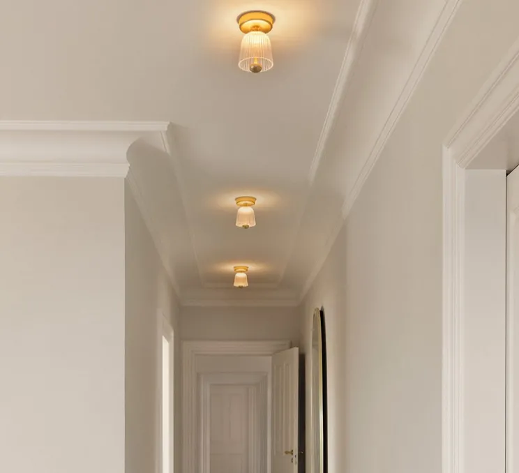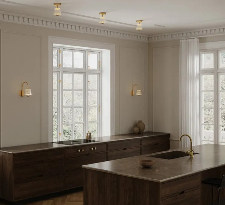 Sa silhouette arrondie évoque une fleur de cloche, avec une structure en laiton satiné associée à un abat-jour en acrylique transparent aux stries naturelles. Cette forme organique adoucit l’espace et diffuse une lumière indirecte agréable. Idéal dans un couloir, une cuisine ou toute pièce à hauteur de plafond réduite, Asteea Ceiling s’installe seul ou en série, selon l’effet recherché.