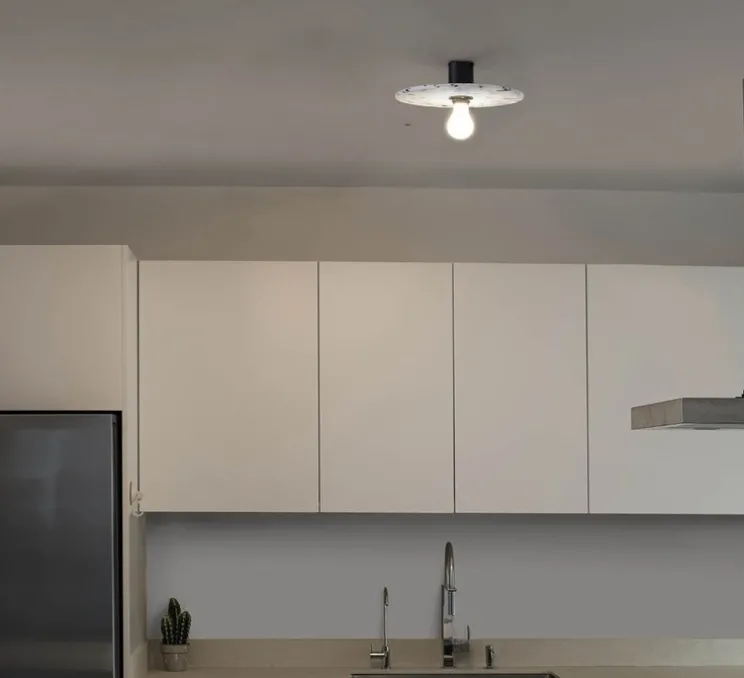 Ce luminaire mesure 30 cm de diamètre pour une profondeur de 7 cm, offrant une présence discrète mais notable. Il est compatible avec une ampoule E27 d’une puissance maximale de 15W (non incluse).