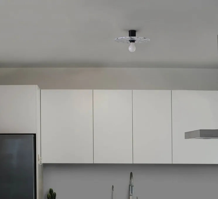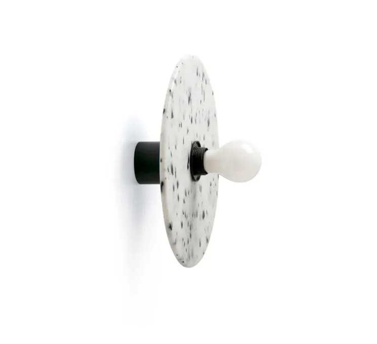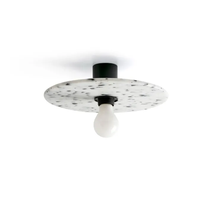 Dotée d’un abat-jour en plastique recyclé aux motifs marbrés noirs et blancs, et d’une structure en aluminium noir mat, la Confetti 450 est un luminaire polyvalent. Elle peut être installée en applique murale mais également en plafonnier, s’intégrant harmonieusement dans divers espaces intérieurs.