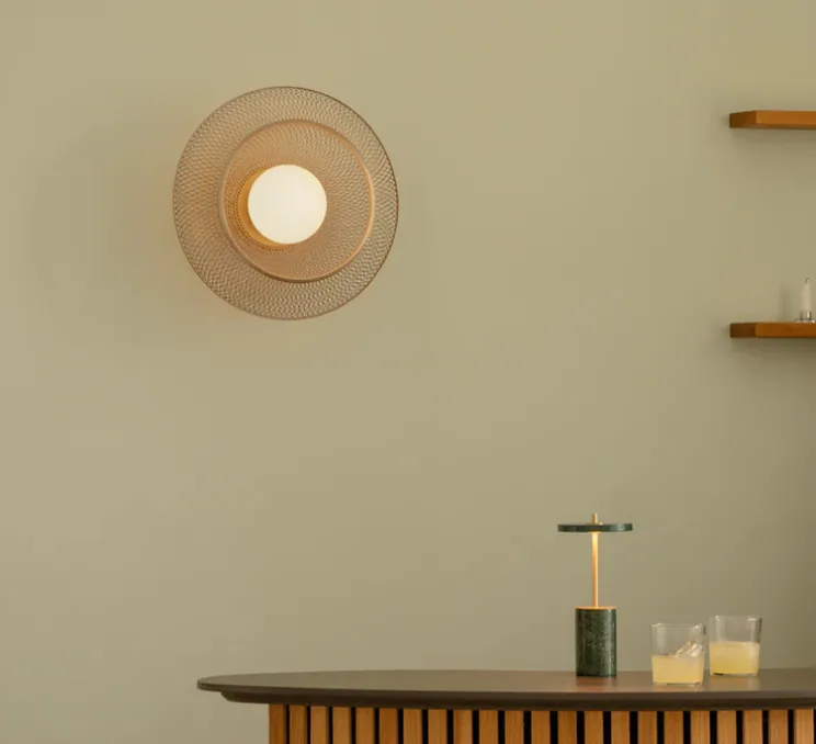 Le même maillage en acier caractéristique que celui de la cage compose l’ensemble du luminaire. Le bouclier en coloris laiton de l’abat-jour Faraday capte parfaitement la lumière du globe en verre opale et crée une lumière ambiante envoûtante.