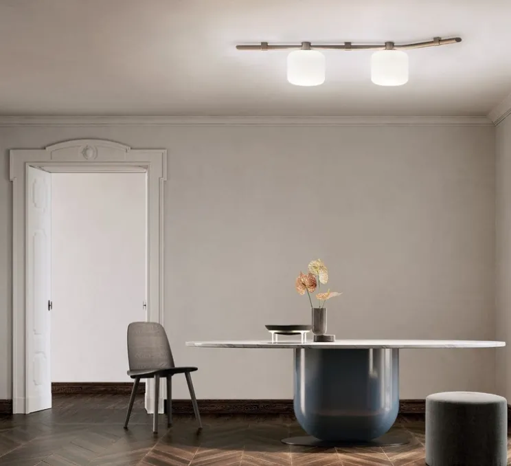 Son diffuseur en verre opalin soufflé double couche est associé à une structure en métal laqué bronze, créant un contraste subtil entre douceur et rigueur. La lumière, douce et enveloppante, se diffuse sans éblouir, apportant une ambiance chaleureuse et raffinée.