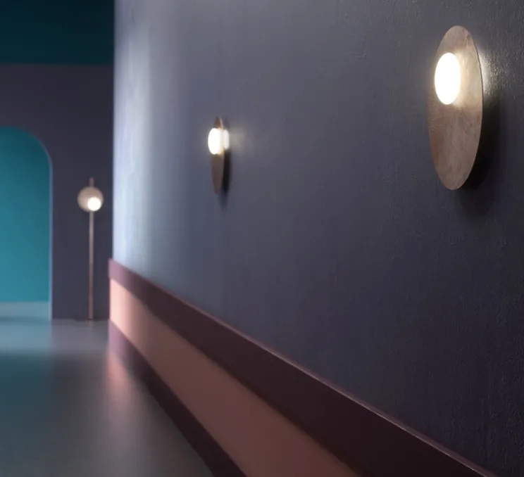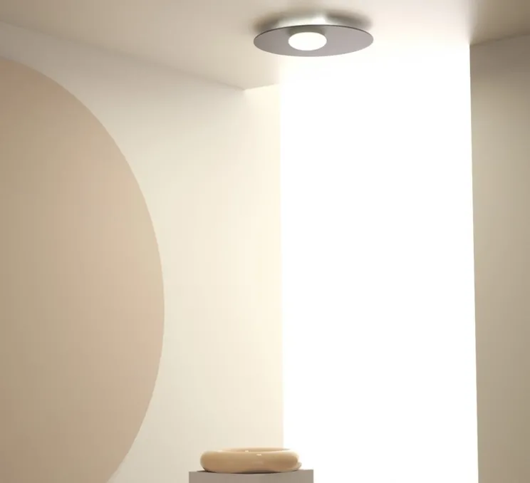 Un diffuseur semi-sphérique, en verre soufflé, contient la source de lumière LED intégrée et se superpose à un disque circulaire en aluminium peint.