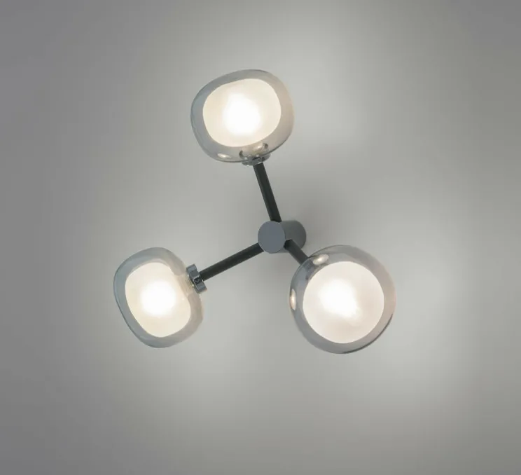 Un objet sphérique brillant double face en verre borosilicaté rend ces lampes disponibles en différentes compositions et une structure en métal revêtu de poudre époxy enrichie de détails en chrome.