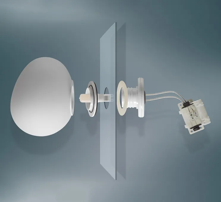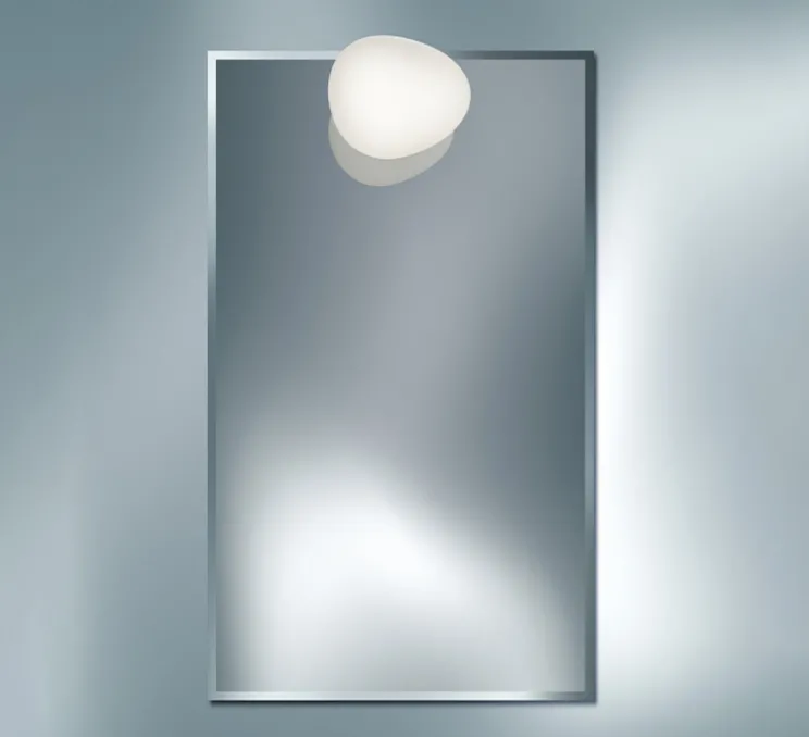 Le luminaire Gregg est composé d’une base de fixation spécialement pensée pour les miroirs et d’un abat-jour en forme de galet en verre soufflé blanc satiné. Son éclairage diffus permet une ambiance de qualité et un flux lumineux perfomant.