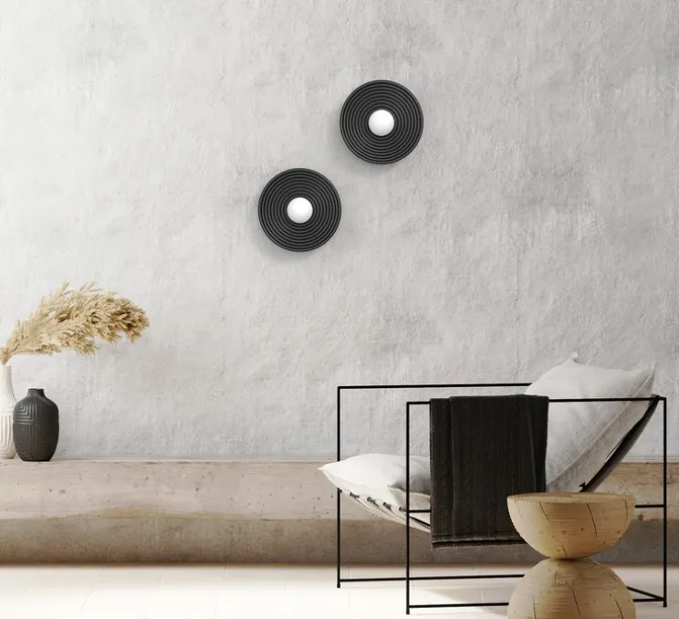 Conçue pour une installation murale ou au plafond, elle se présente comme une structure en aluminium circulaire avec un verre opalin en son centre. Son design graphique est adouci par le globe en verre en son centre, qui renferme la source lumineuse. Diffusant une lumière douce et enveloppante, elle apporte une touche de raffinement qui s’inspire d’un équilibre entre fonctionnalité et présence visuelle.