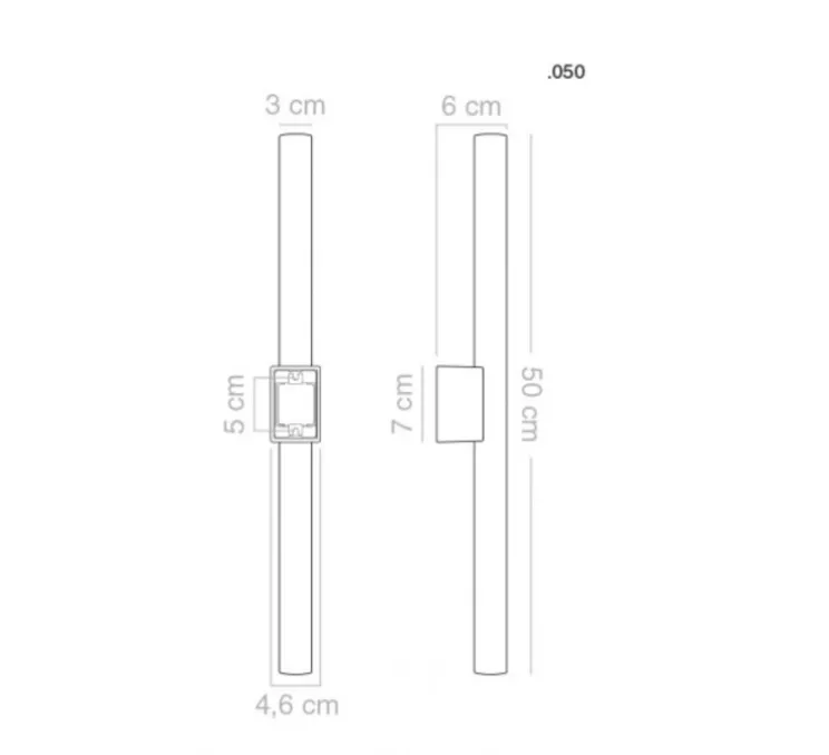 Cette version mesure 50 cm de longueur, 6 cm de profondeur et 4,6 cm de profondeur. Non dimmable. Vis de fixation incluses. L’ampoule tubulaire opaline de 50 cm, avec une puissance de 4,8W est fournie et dégage 470 lumens avec une colorimétrie de 2700K.