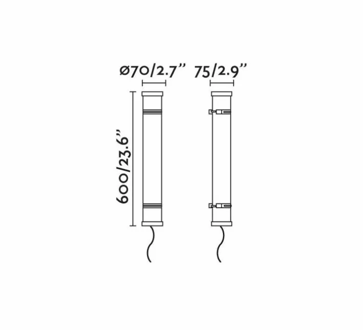Le luminaire est en acier inoxydable, il se compose d’un tube blanc avec des finitions en aciers aux extrémités.