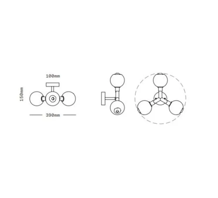 L’applique mesure 39cm de hauteur et chacune des sphères a un diamètre de 11cm. Elle est fournie avec sa source de lumière, 3 ampoules G9.