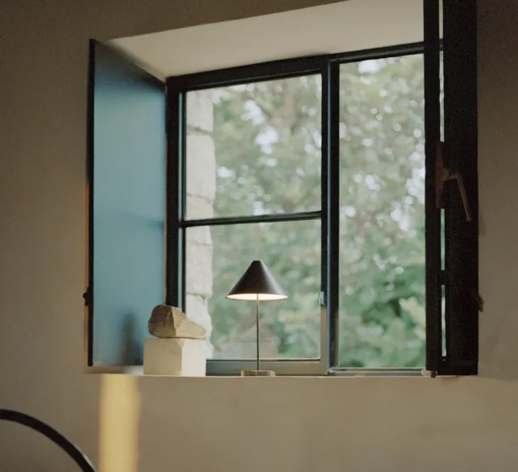 Brolly est une baladeuse et lampe de table en acier brossé à l’allure simple et minimaliste. La forme conique géométrique de l’abat-jour en acier associée à la tige délicate de la base font de la baladeuse un objet de décoration à part entière.