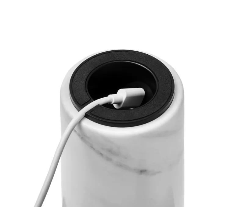 Avec le marbre comme élément porteur, la lampe obtient une stabilité naturelle et la pierre polie est agréable au toucher. Comme la lumière se répand de toute la partie supérieure de la lampe, la petite lampe à poser offre un rendement lumineux élevé. Un cercle en métal fraisé tourné sur le dessus de la lampe ajoute un détail raffiné au design, et en tapant doucement sur le cercle, la lumière peut être réglée sur trois niveaux différents.
