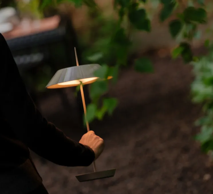 Cette version mobile fonctionne sur batterie rechargeable. Elle est idéale pour être déplacée en fonction de nos besoins (Attention, la lampe ne résiste pas aux intempéries extérieures). Elle s’allume et s’éteint au moyen d’un capteur tactile présent dans le socle qui permet aussi de régler l’intensité.