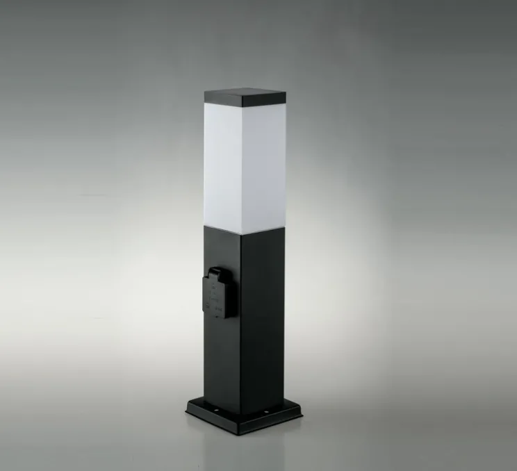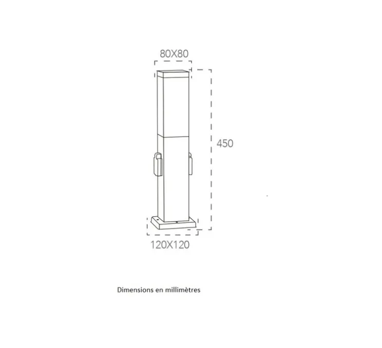Cette borne de couleur grise a pour particularité d’éclairer grâce à son diffuseur et de posséder deux prises électriques d’une capacité maximum de 15 A, 250 V et 2500 W.